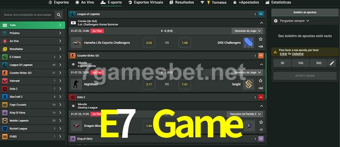 O E7 Game oferece uma grande seleção de opções de apostas em e-sports com probabilidades competitivas